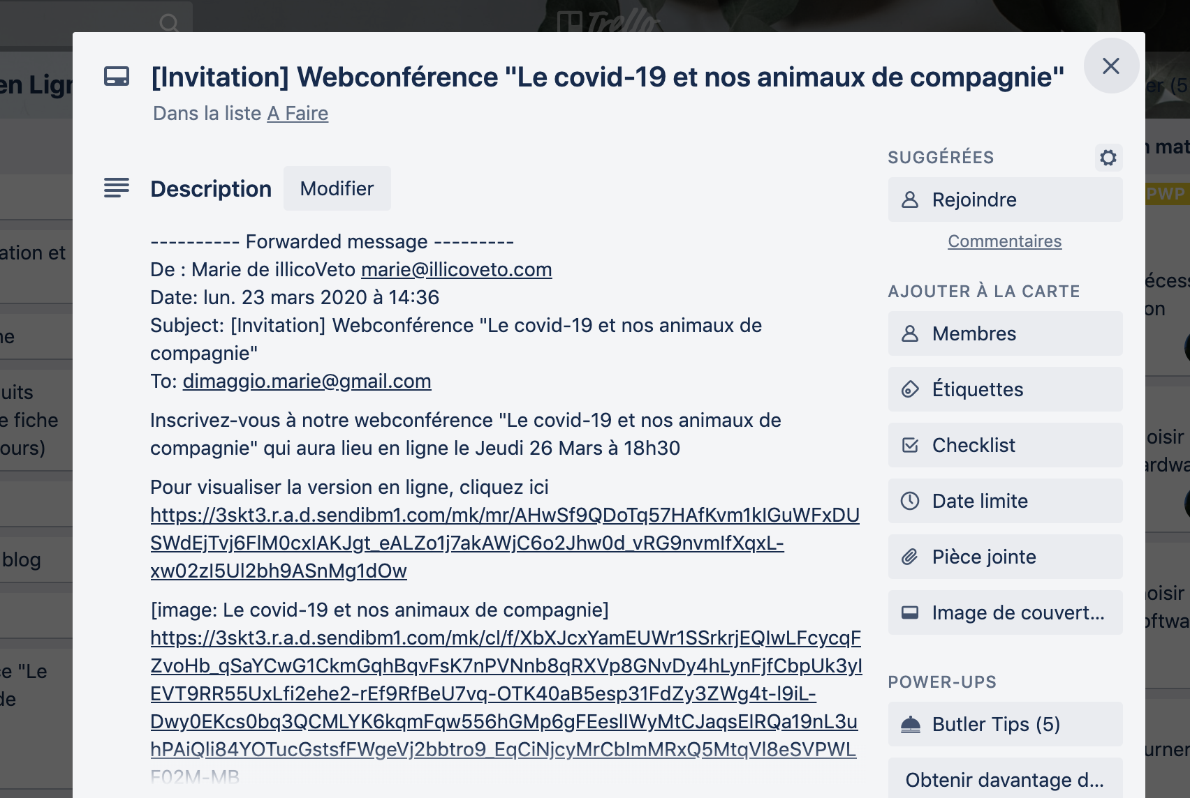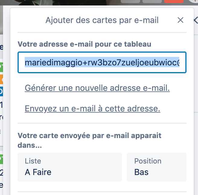 Une fois dans votre logiciel de messagerie, vous pourrez ainsi transférer un email vers votre adresse email personnalisé. Il sera automatiquement transformé en carte (l’objet du mail apparaîtra sur la carte et le contenu de l’email sera collé dans la description).