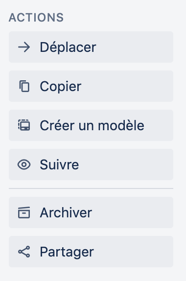 Chaque carte peut être déplacée, copiée, archivée (c’est comme ça que vous pouvez supprimer un élément sur Trello) ou encore servir de modèle. Cette dernière fonction est extrêmement pratique lorsque vous devez répéter la même tâche plusieurs fois (créer un article de blog, filmer une vidéo YouTube, etc).